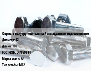 Болт с полукруглой головкой и квадратным подголовником 12х100 DIN 603 FT Сталь: А4 М12