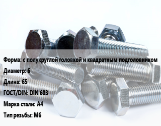 Болт с полукруглой головкой и квадратным подголовником 6х65 DIN 603 Сталь: А4 М6