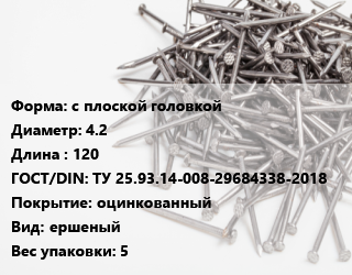 Гвоздь с плоской головкой 4.2х120 ГОСТ: ТУ 25.93.14-008-29684338-2018 оцинкованный ершеный 5