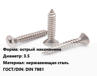 Саморез острый наконечник D=3.5 нержавеющая сталь ГОСТ: DIN 7981