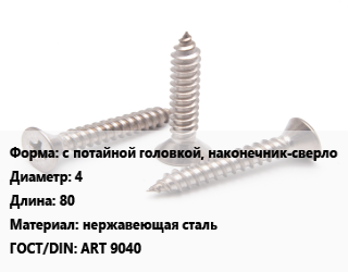 Саморез с потайной головкой, наконечник-сверло D=4 L=80 нержавеющая сталь ГОСТ: ART 9040