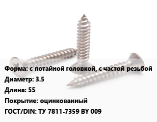 Саморез с потайной головкой, с частой резьбой D=3.5 L=55 оцинкованный ГОСТ: ТУ 7811-7359 BY 009