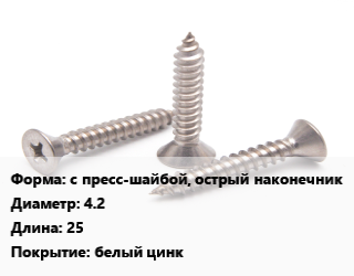 Саморез с пресс-шайбой, острый наконечник D=4.2 L=25 белый цинк