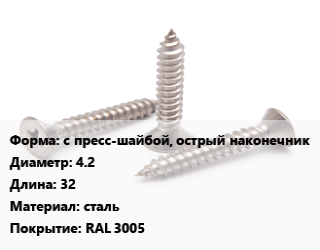 Саморез с пресс-шайбой, острый наконечник D=4.2 L=32 сталь RAL 3005