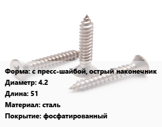 Саморез с пресс-шайбой, острый наконечник D=4.2 L=51 сталь фосфатированный