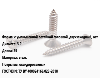Саморез с уменьшенной потайной головкой, двухзаходный, ост D=3.9 L=25 сталь оксидированный ГОСТ: ТУ BY 400024166.023-2018