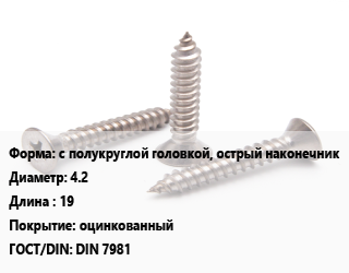 Саморез с полукруглой головкой, острый наконечник D=4.2 L=19 оцинкованный ГОСТ: DIN 7981
