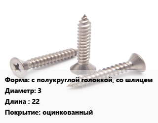 Саморез с полукруглой головкой, со шлицем D=3 L=22 оцинкованный