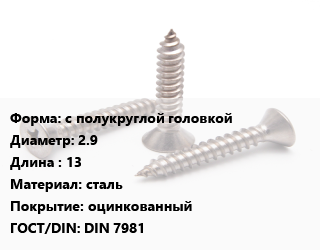 Саморез с полукруглой головкой D=2.9 L=13 сталь оцинкованный ГОСТ: DIN 7981
