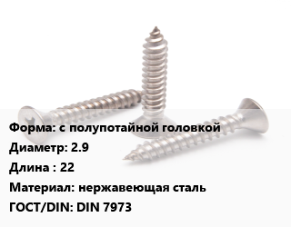 Саморез с полупотайной головкой D=2.9 L=22 нержавеющая сталь ГОСТ: DIN 7973