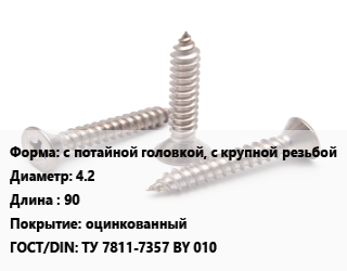 Саморез с потайной головкой, с крупной резьбой D=4.2 L=90 оцинкованный ГОСТ: ТУ 7811-7357 BY 010