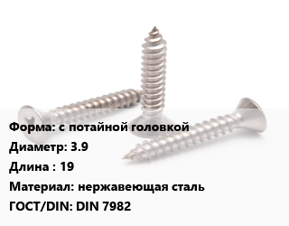 Саморез с потайной головкой D=3.9 L=19 нержавеющая сталь ГОСТ: DIN 7982