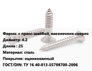 Саморез с пресс-шайбой, наконечник-сверло D=4.2 L=25 сталь оцинкованный ГОСТ: ТУ 16 40-013-55798700-2006