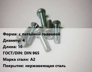 Винт с потайной головкой 4х10 DIN 965 Сталь: А2 нержавеющая сталь