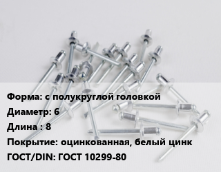Заклепка с полукруглой головкой 6х8 оцинкованная, белый цинк ГОСТ: ГОСТ 10299-80