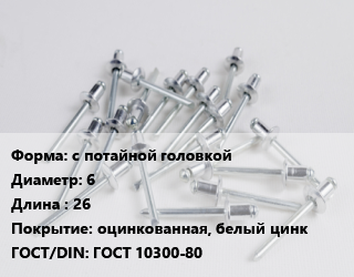 Заклепка с потайной головкой 6х26 оцинкованная, белый цинк ГОСТ: ГОСТ 10300-80