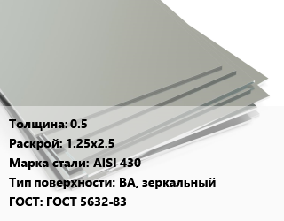 Лист нержавеющий 0.5 1.25х2.5 Сталь: AISI 430 Тип:BA, зеркальный ГОСТ 5632-83
