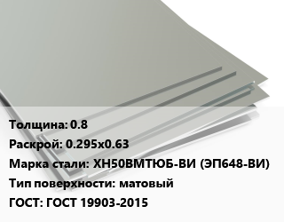 Лист нержавеющий 0.8 0.295х0.63 Сталь: ХН50ВМТЮБ-ВИ (ЭП648-ВИ) Тип:матовый ГОСТ 19903-2015