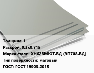 Лист нержавеющий 1 0.3х0.715 Сталь: ХН62ВМЮТ-ВД (ЭП708-ВД) Тип:матовый ГОСТ 19903-2015