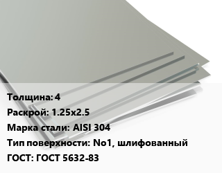 Лист нержавеющий 4 1.25х2.5 Сталь: AISI 304 Тип:No1, шлифованный ГОСТ 5632-83