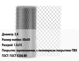 Сетка-рабица 2.8 Ячейка: 50х50 1.5х15 оцинкованная, с полимерным покрытием ПВХ ГОСТ: ГОСТ 5336-80