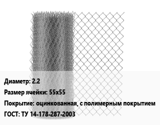 Сетка-рабица 2.2 Ячейка: 55х55 оцинкованная, с полимерным покрытием ГОСТ: ТУ 14-178-287-2003